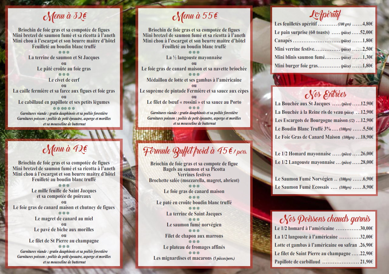 Laissez la magie de Noël enchanter vos papilles avec notre menu spécialement conçu pour cette fête chaleureuse. Des saveurs traditionnelles revisitées avec notre savoir-faire pour un moment de partage inoubliable.